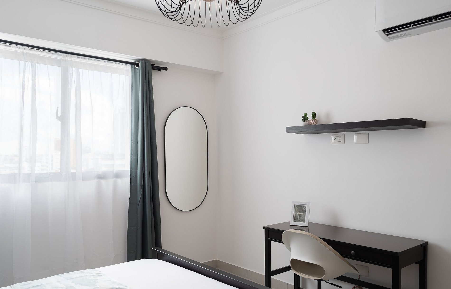 The bedroom offers a tranquil haven with a cozy queen-sized bed, ensuring a restful night's sleep. Wake up to the invigorating cityscape right outside your window and prepare for the day ahead.