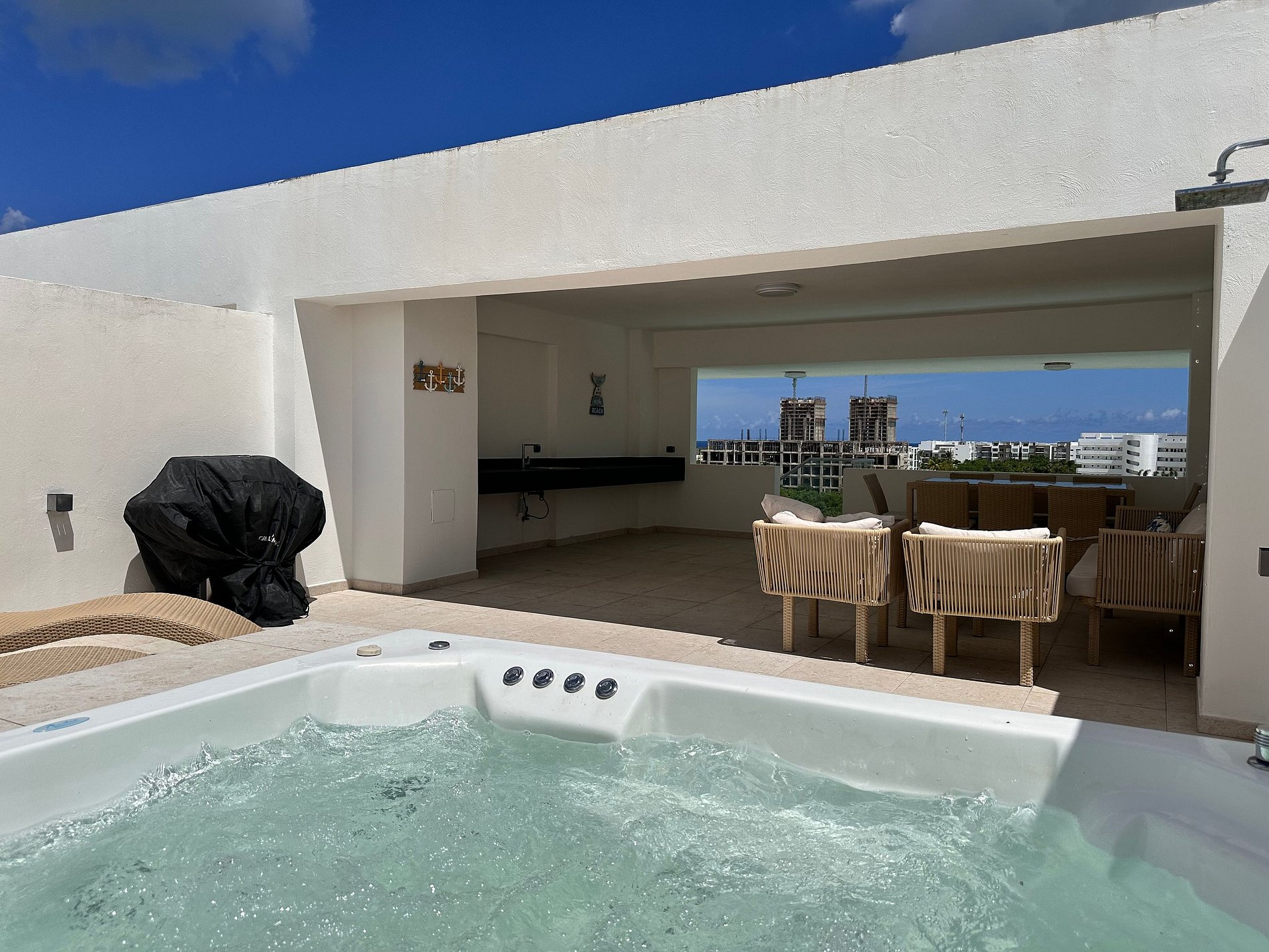 A private terrace with an outdoor dining area and Jacuzzi, the ideal spot to unwind under the Caribbean sky