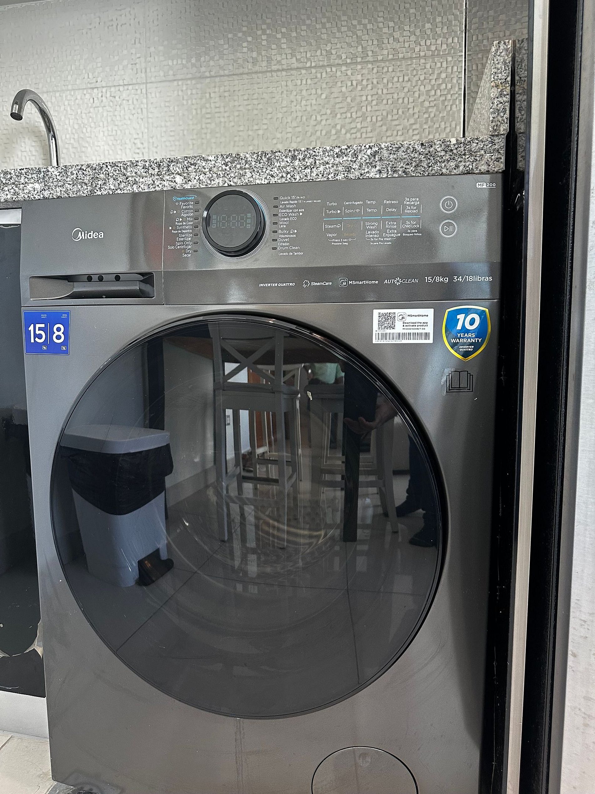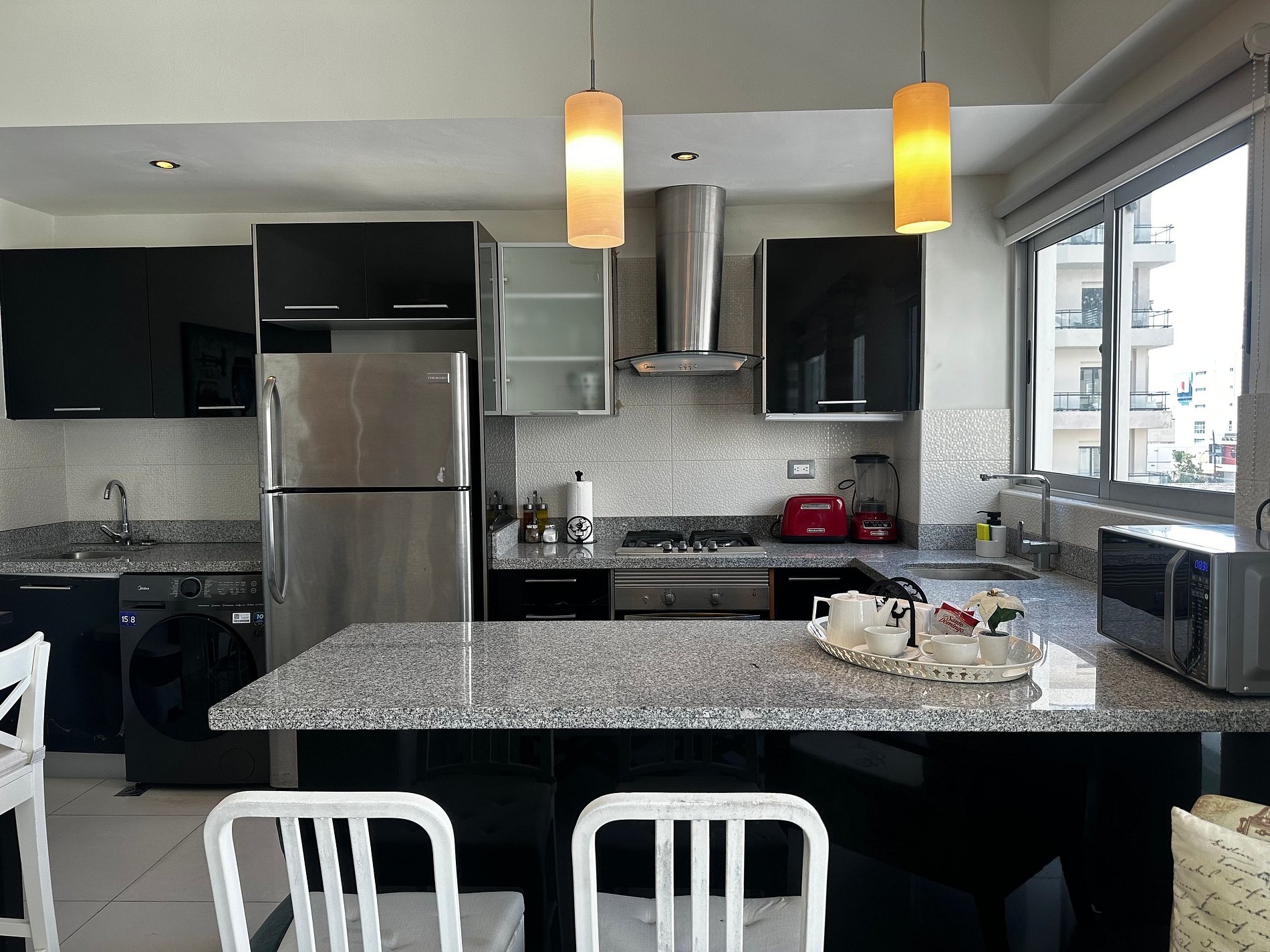 The fully equipped kitchen boasts stainless steel appliances, granite countertops, and everything you need to whip up delicious meals during your stay. Enjoy your culinary creations at the elegant dining table, or take advantage of the sunny balcony for alfresco dining with a view.
