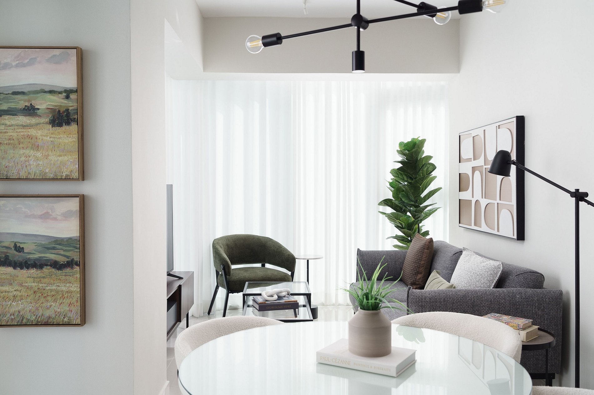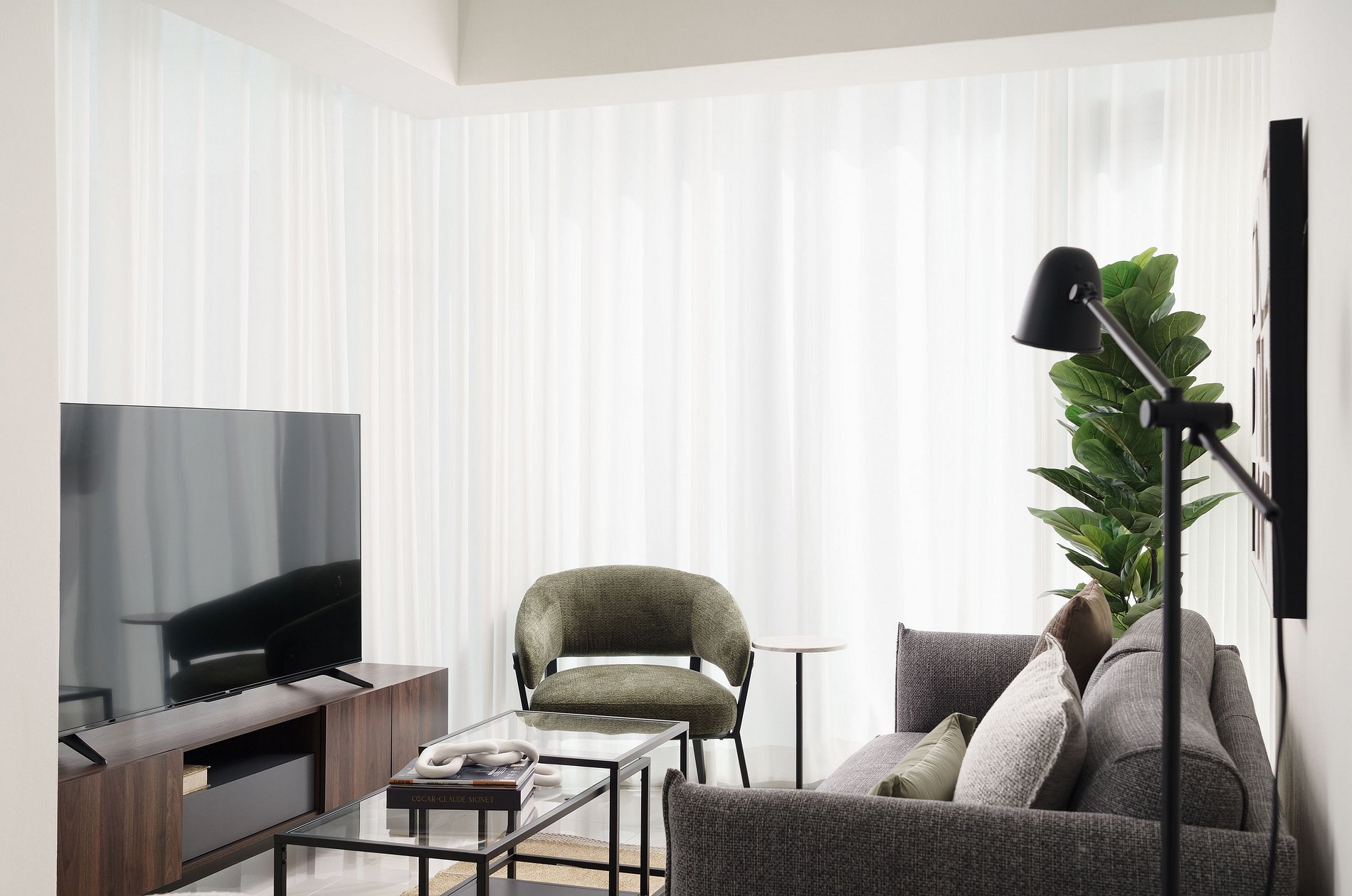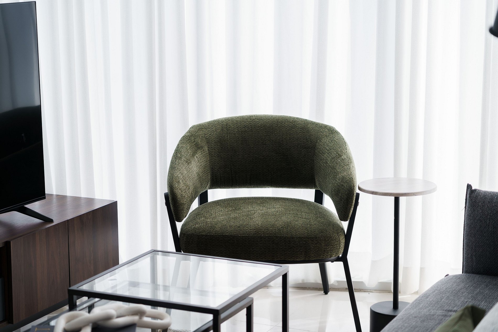 Step into your stylishly furnished apartment featuring contemporary decor and high-end amenities. The spacious living area is ideal for relaxation, complete with plush seating, a flat-screen TV, and large windows offering panoramic views of the city skyline.