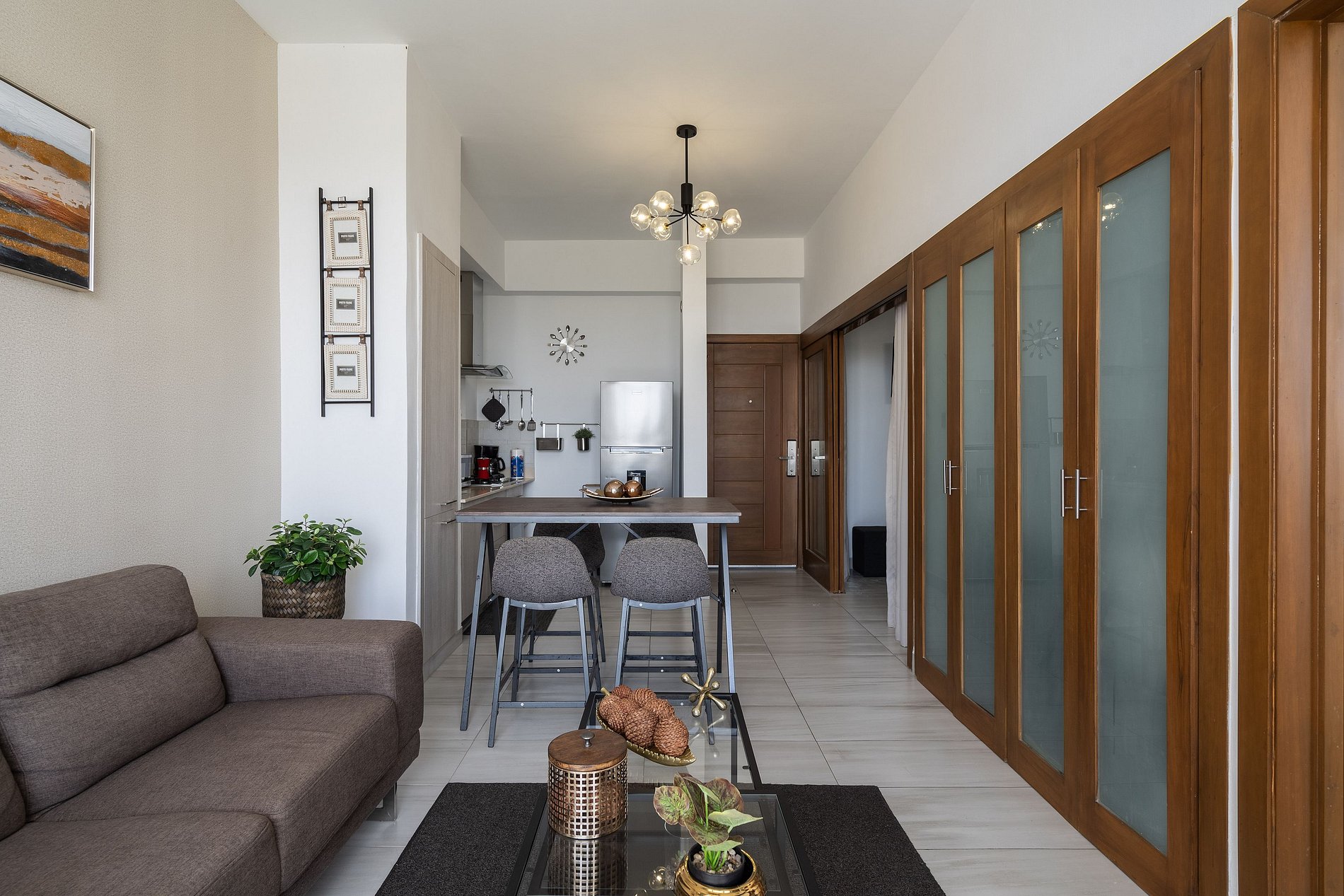 The living area is cozy and inviting, perfect for unwinding after a day of exploring the city. Large windows provide amazing vistas of the sparkling Caribbean Sea, making every moment in this apartment truly special.