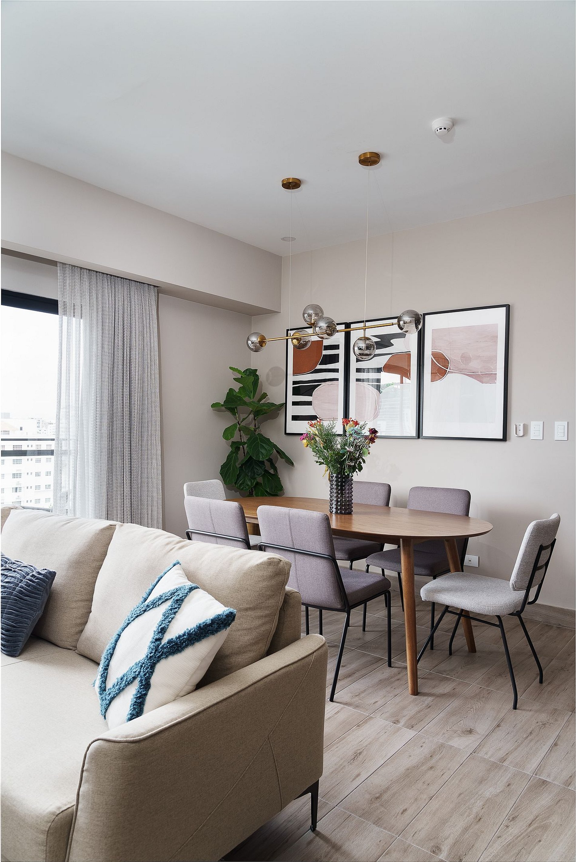 This is a contemporary space with mid-century vibes, featuring perfect natural lighting that creates a tranquil ambiance. Each piece of furniture has been carefully selected to provide a truly special environment.
