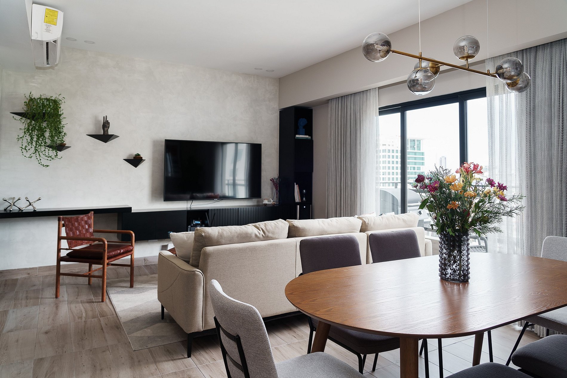 This is a contemporary space with mid-century vibes, featuring perfect natural lighting that creates a tranquil ambiance. Each piece of furniture has been carefully selected to provide a truly special environment.