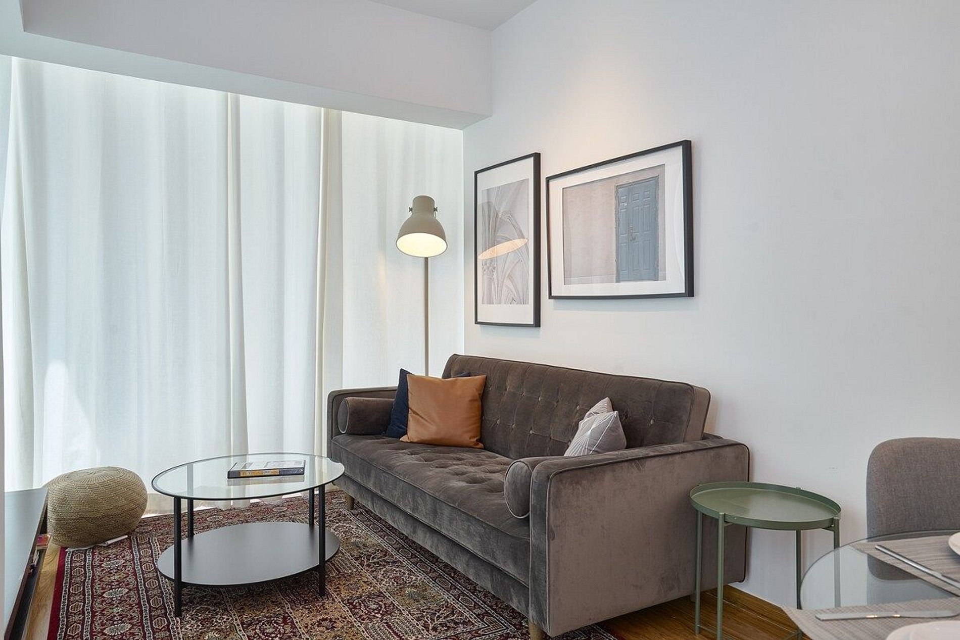 Step into your stylishly furnished apartment featuring contemporary decor and high-end amenities. The spacious living area is ideal for relaxation, complete with plush seating, a flat-screen TV, and large windows offering panoramic views of the city skyline.