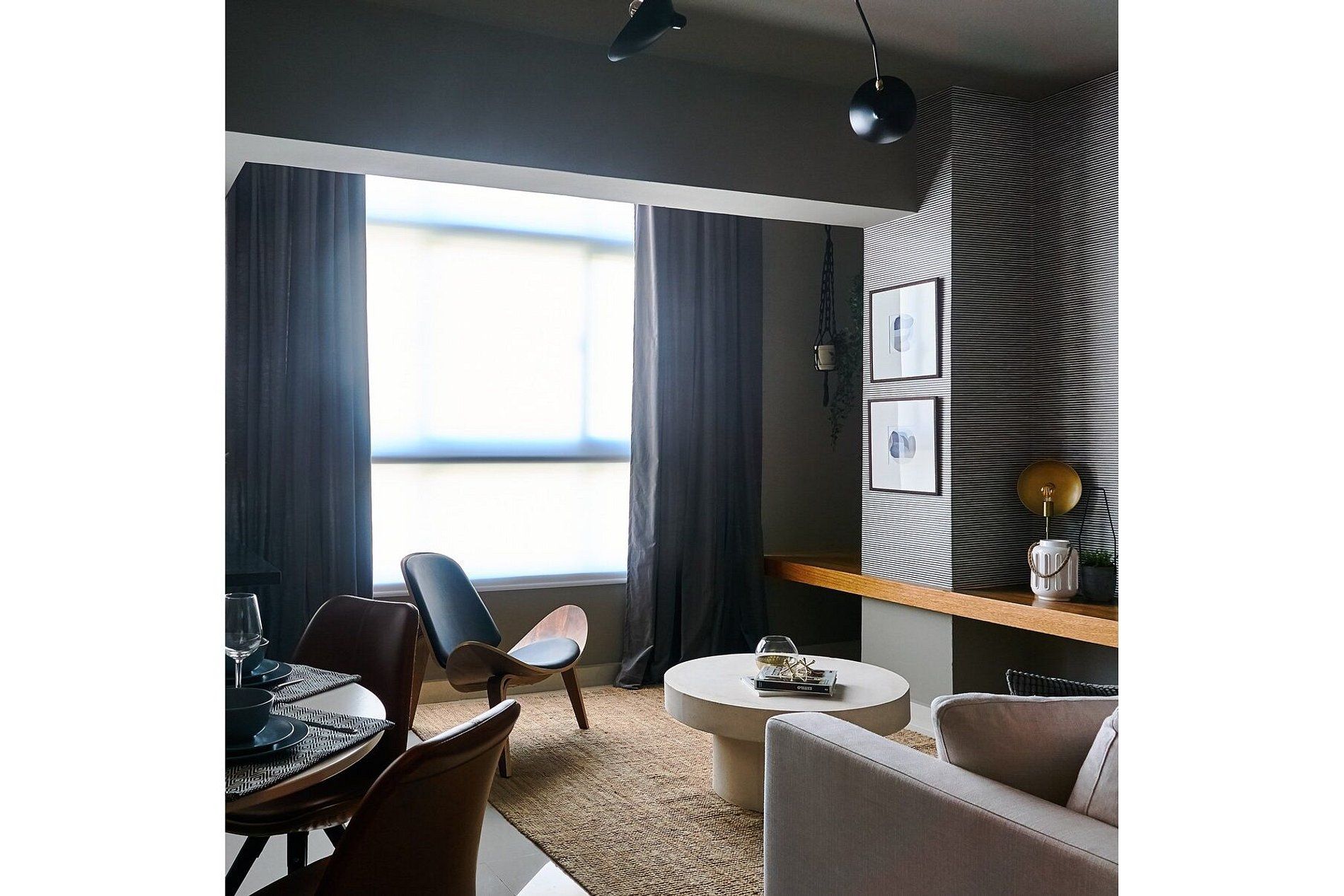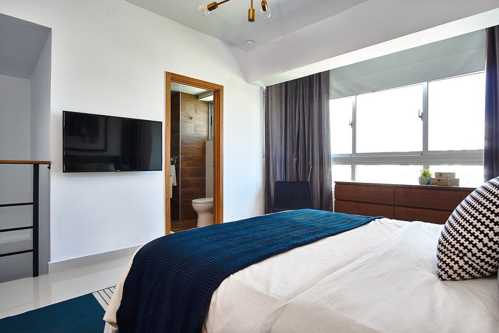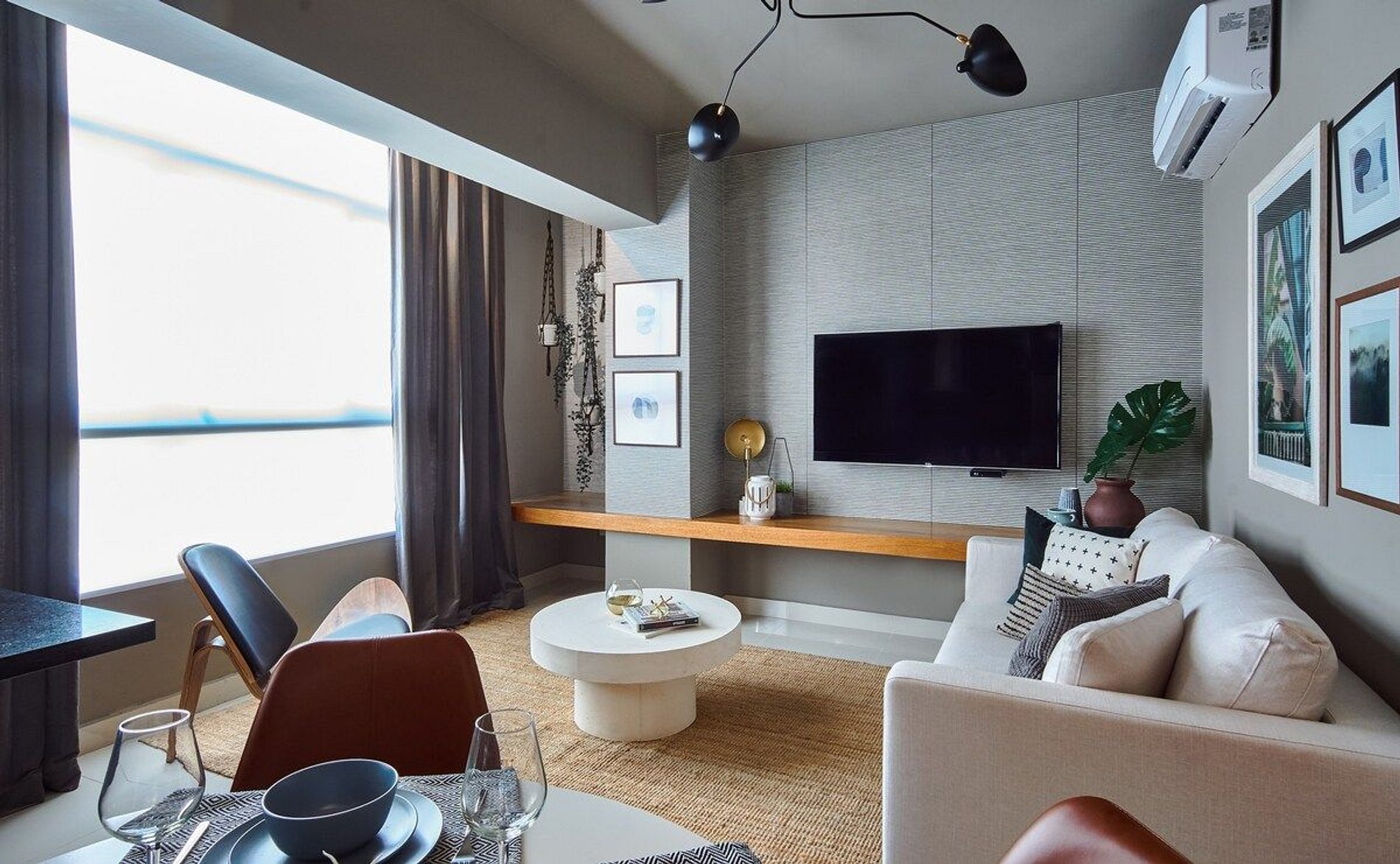 Spacious Living Area: Enjoy the open and airy living room with a comfortable sofa and a large flat-screen TV, perfect for relaxing after a day of exploring the city.