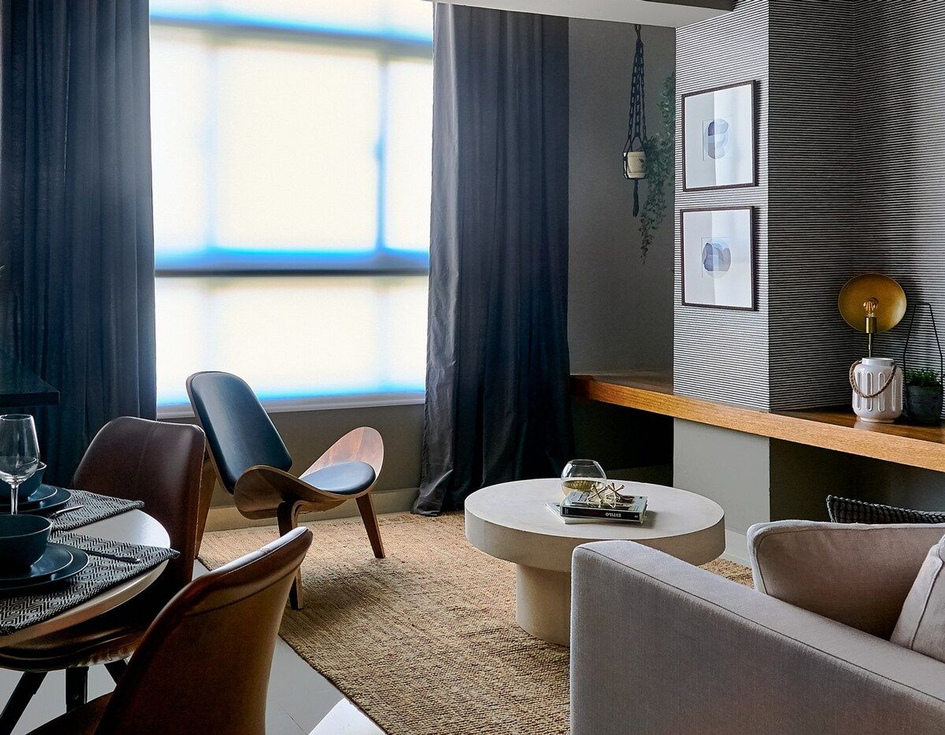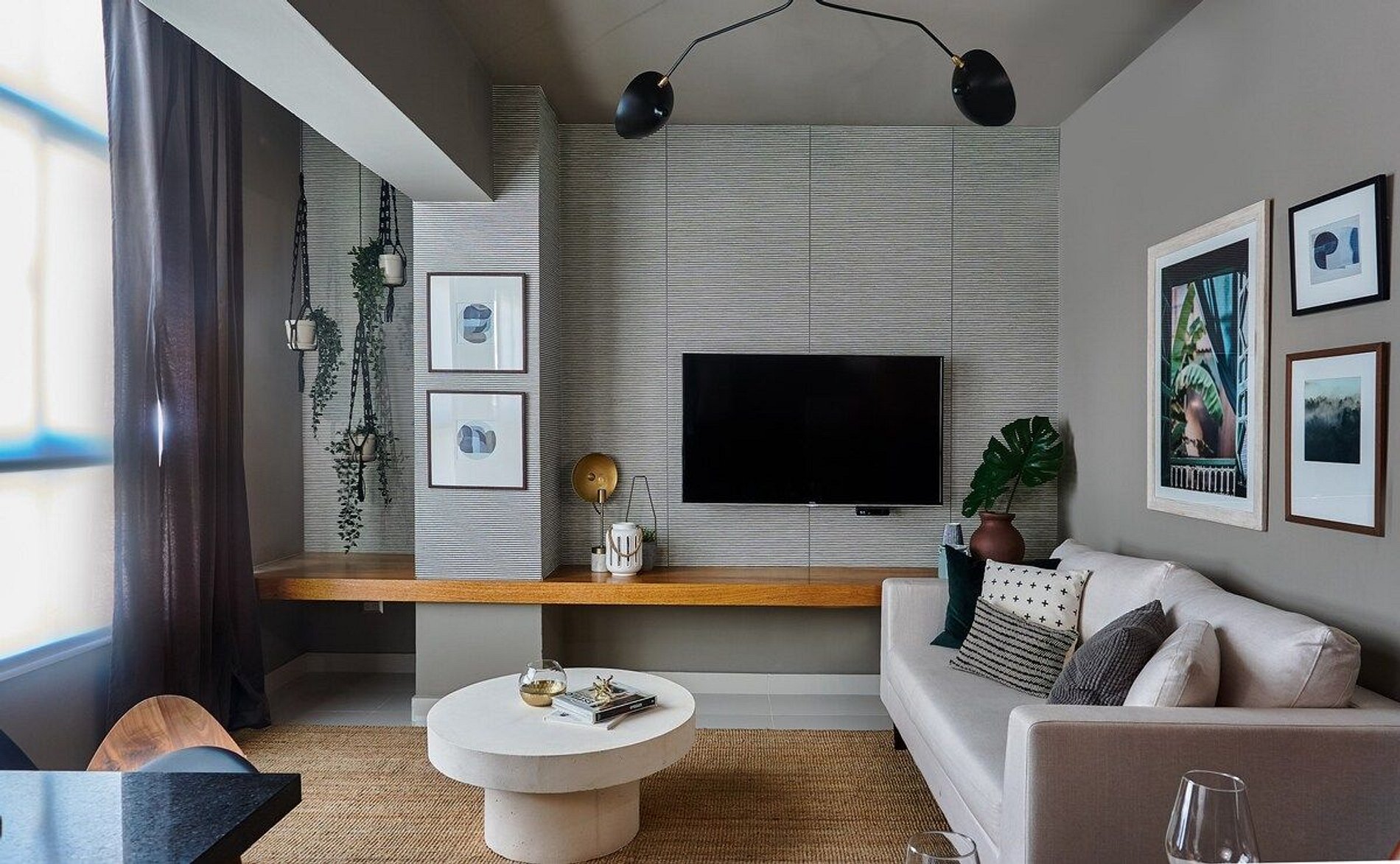 Spacious Living Area: Enjoy the open and airy living room with a comfortable sofa and a large flat-screen TV, perfect for relaxing after a day of exploring the city.
