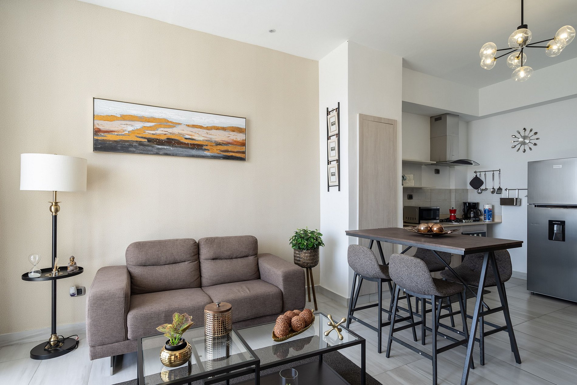 The living area is cozy and inviting, perfect for unwinding after a day of exploring the city. Large windows provide amazing vistas of the sparkling Caribbean Sea, making every moment in this apartment truly special.