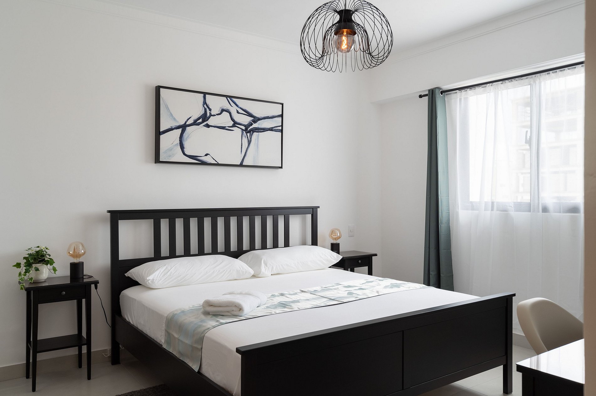 The bedroom offers a tranquil haven with a cozy queen-sized bed, ensuring a restful night's sleep. Wake up to the invigorating cityscape right outside your window and prepare for the day ahead.