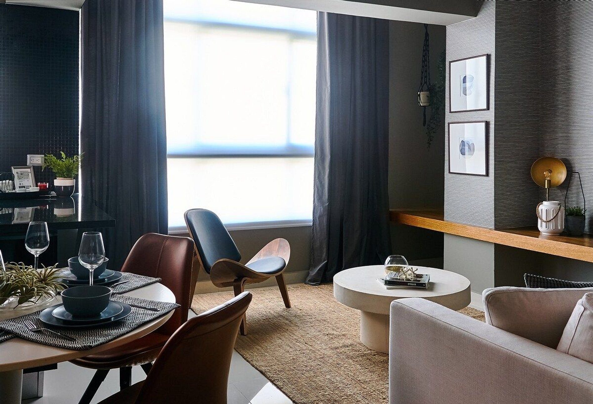Spacious Living Area: Enjoy the open and airy living room with a comfortable sofa and a large flat-screen TV, perfect for relaxing after a day of exploring the city.